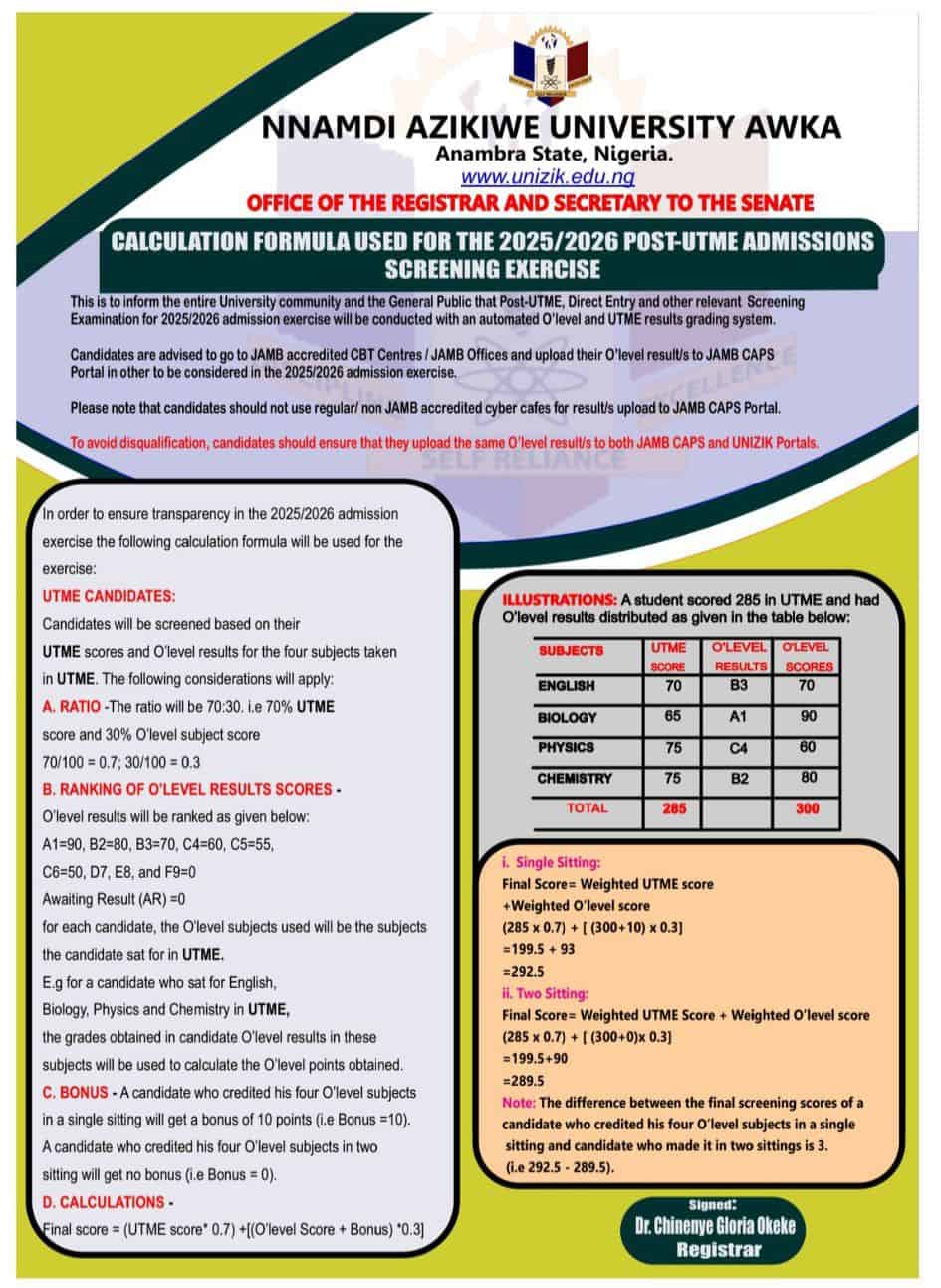 Nnamdi Azikiwe University Awka has released the official formula for calculating admission scores for the 2025/2026 screening. The process combines UTME and O’level grades with a set ratio and bonus marks. Candidates are urged to upload results correctly to both JAMB CAPS and UNIZIK portals.